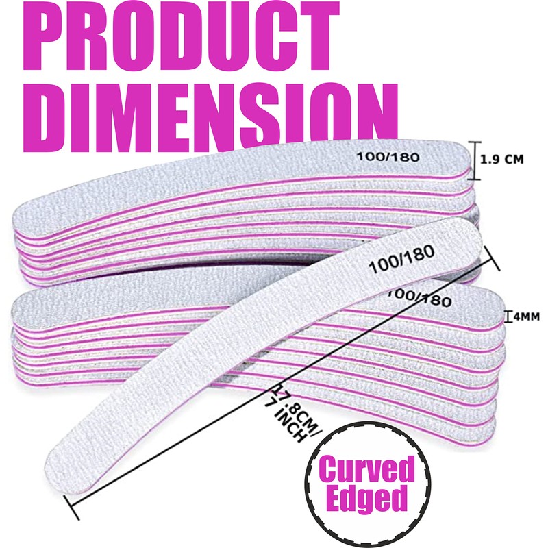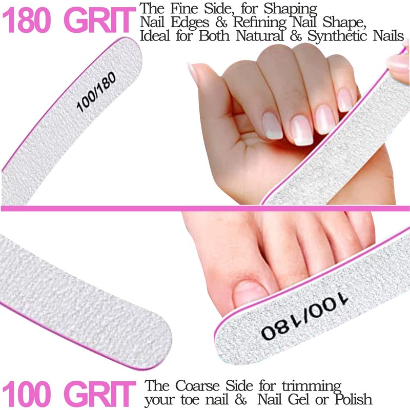 - Double-sided Nail File with 100/180 Grit - Our nail files feature a double-sided design. The 100 Grit side is coarse, making it suitable for use on toenails and helping to remove nail gel. The 180 Grit side is fine and ideal for trimming nail edges and refining shapes, whether you have natural or acrylic nails. These files are washable and can be easily rinsed with antibacterial soap and disinfectant.