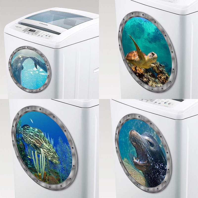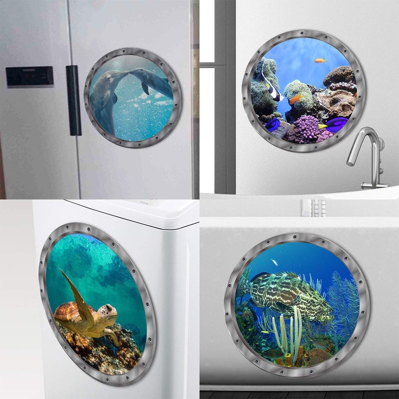 5 Pcs Ocean World Wall Window Stickers, 11 Inches Sea Turtle Dolphin Seal Porthole 3D Frosted Translucent Sticker Sea Life Wall Decor