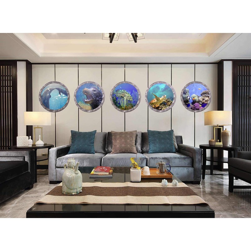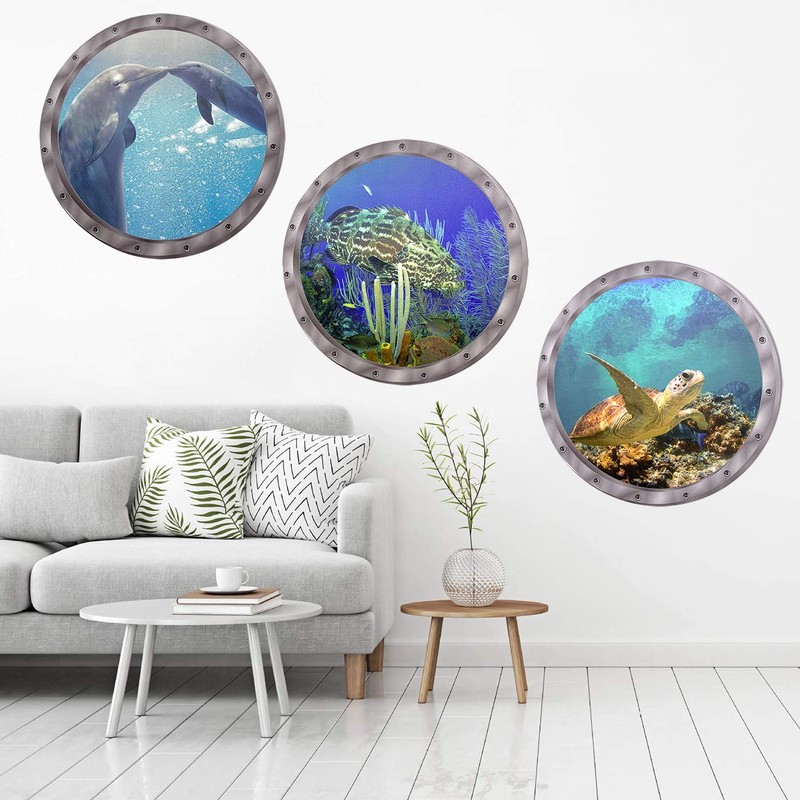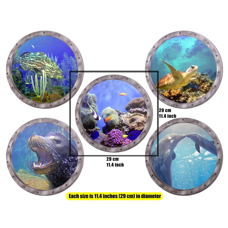 - Package includes: 5 PCS Ocean World Wall Stickers & 1 plastic spatula. Each sticker is 11 inches in diameter. Including dolphins, turtles, seals, groupers, coral patterns.
