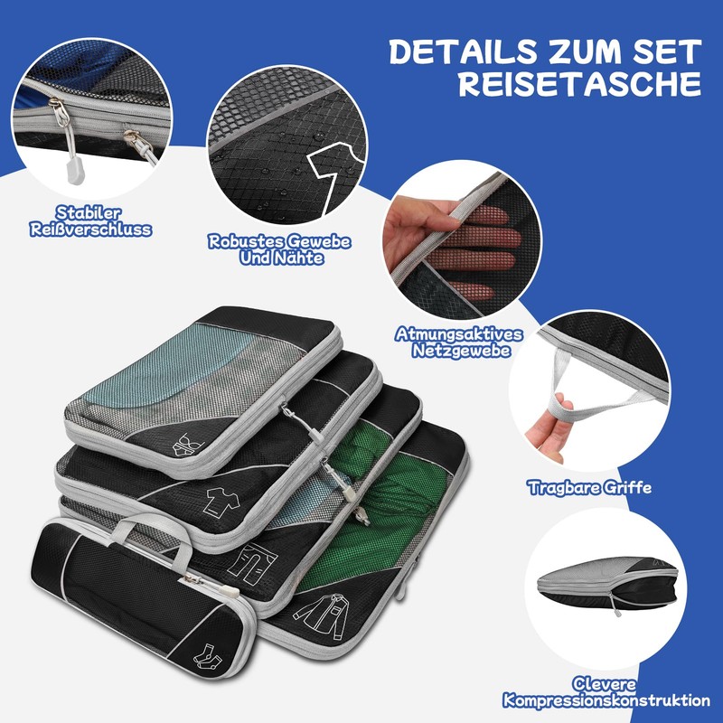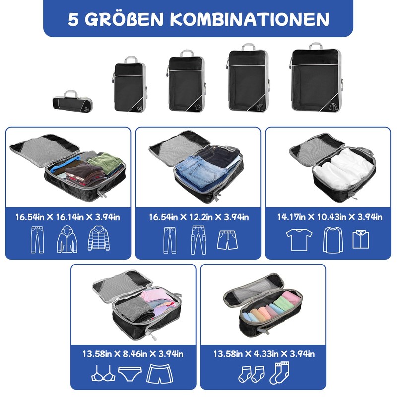 - 5-piece packing cube compression set: the suitcase organiser set contains 5 packing cubes, various size combinations can be possible to store thick jackets, trousers, underwear, shoes and everything else you need when travelling. Suitcase organiser packing bags set hand wash and machine washable.