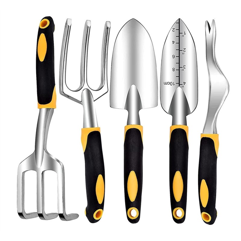 - Set of 5: Professional garden tools set includes hand trowel, spade transplanter, cultivator, hand rake and weeder. Multiple functional garden tools help you to finish gardening work easily.