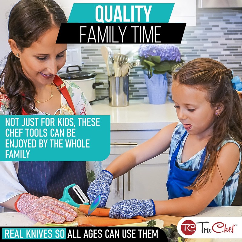 - KIDS KNIFE SET FOR REAL COOKING – 5 Piece Kids Knife Set in Aqua – Childrens cooking knives with Kids Chef Knife, Kids Paring Knife, Kids Tomato Knife, Kids Peeler & Universal Holder – TruChef
