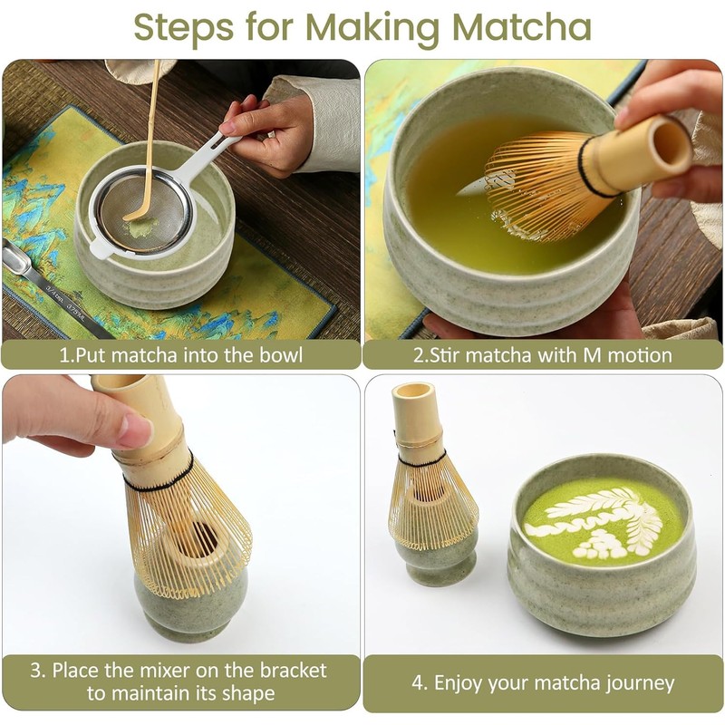 - HIGH QUALITY SET This set contains five professional utensils for the matcha tea ceremony an exquisite matcha bowl, a bamboo tea broom, a tea broom stand, a stainless steel filter and an elegant bamboo teaspoon. It covers all requirements from grinding to filtering to brewing