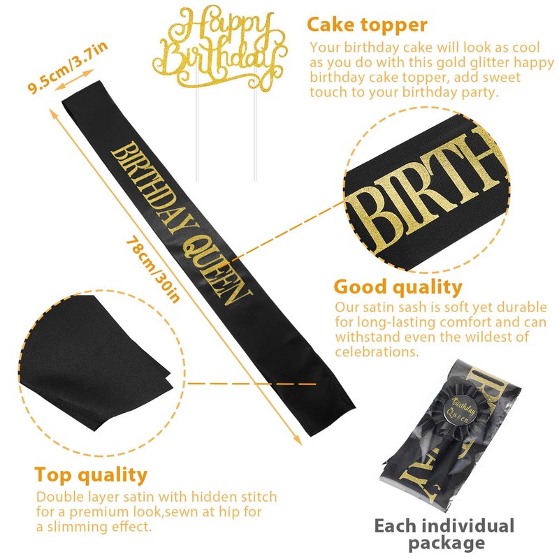 - What you receive: the package consists of 1 piece birthday queen sash, 1 piece golden crown tiara,1 piece tinplate badge pin, 1 piece brooch clip pin, 1 piece happy birthday cake topper, a complete suit of 5 pieces to meet your party needs