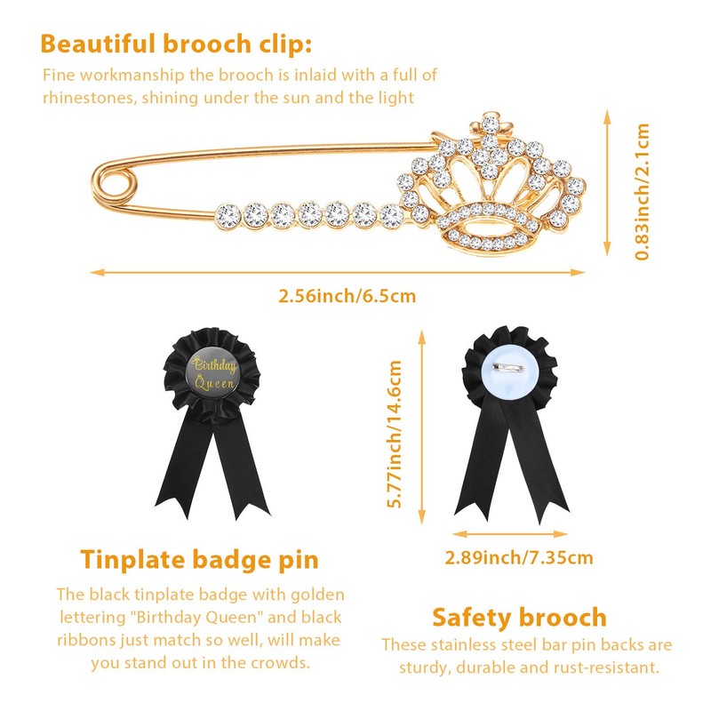 - Tinplate badge pin and brooch clip pin: the black tinplate badge with golden lettering "Birthday Queen" and black ribbons just match so well, besides, golden pin with crown style, make you stand out in the crowds with this beautiful birthday party favor