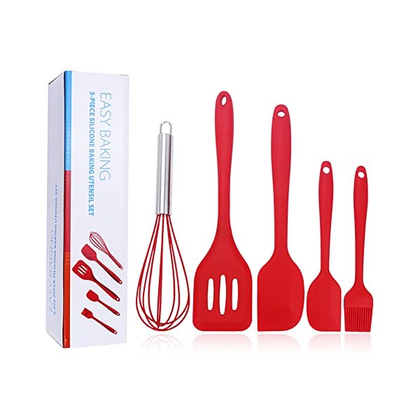 5 Pieces Non-Stick Food Silicone Kitchenware Utensils- Kids Cooking Sets - for Cooking Baking Mixing, Stirring-Ergonomic Dishwasher Safe(Red)
