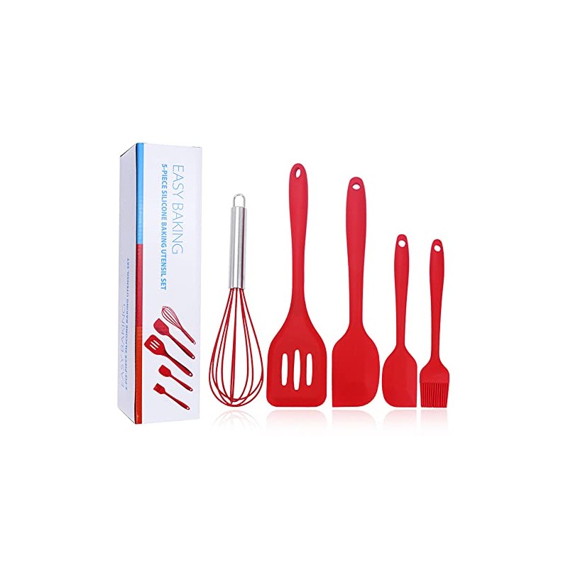 - [Packaging] The set includes: 1 small silicone spatula, 1 large silicone spatula, 1 silicone stirrer, 1 silicone coated stirrer with stainless steel handle and 1 silicone brush. Our kitchen utensils are made of food-safe silicone Made without BPA.