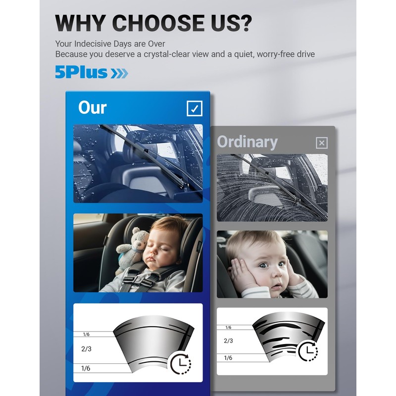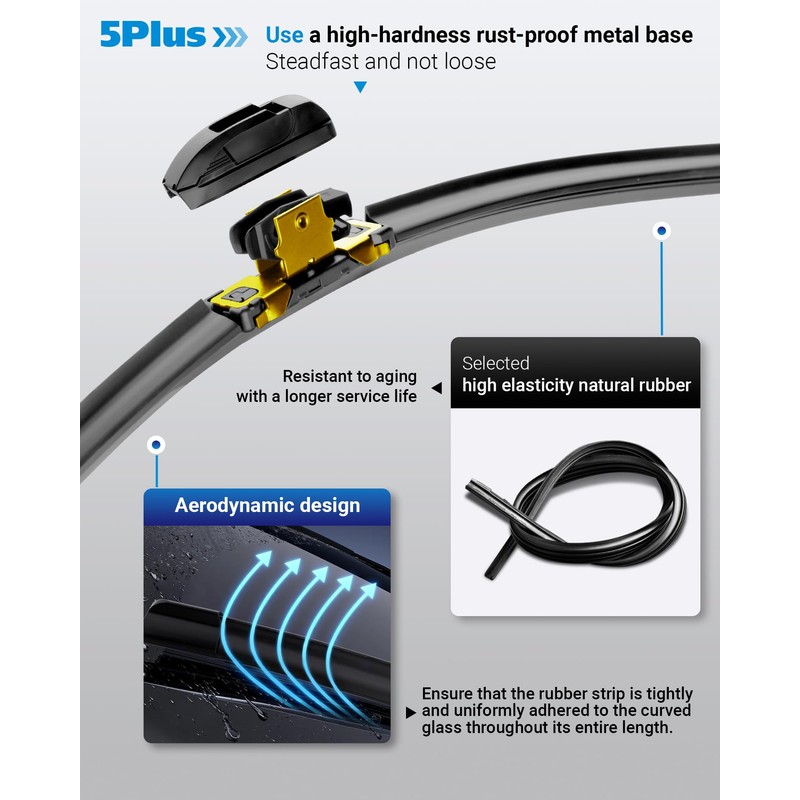 • All-Season Wiper】Good weather resistance allows this wiper to operate normally under many extreme conditions, such as dust, ice and snow, fog and rain. OEM grade silicone, springs, adapters, clips, and spoilers make 5 PLUS wipers 200% better in quality than regular OEM, which also means we have a longer lifespan.