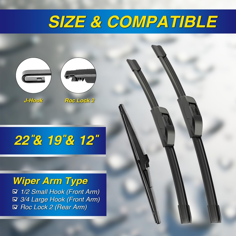 - Product DetailsDriver & passenger & rear(set of 3 ):22"+19"+12" Windshield Wiper Blades (Fit U/J Hook Front Wiper Arm)