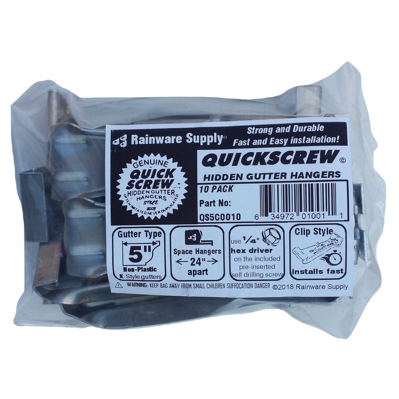 Features: Strength: This hanger is Self-bracing at the greatest stress points. The curved shape gives the body of the hanger greater strength and reinforcing ribs run the entire length of the hanger. Durability: Screws stay in longer than spikes over time, All aluminum surfaces are corrosive free unlike steel which even if coated will eventually rust. Fast, Easy, Blemish Free installation: The Angled Screw Design is superior to straight hangers or spikes, the screw is held precisely while allowing the drill driver bit holder to clear the gutters outer edge. Attractive Appearance: Completey invisible from below the eave once installed. Fits tightly in the gutter nose & clips snugly to the back of the gutter. Comes with a pre inserted 3" long, 1/4 " hex head self piercing screw with a taller head than the competition for more rapid and better tool engagement and increased tool life. It also keeps the screws from slipping out of the drivers as easily. For installation directly through the fascia into the rafter end with 1-3/8" total penetration depth. Recommended hanger spacing is 24" on centers. Great for Straight or Angled Fascia Boards and Re-enforcing Existing Gutters Preferred by gutter contractors throughout the U.S.
