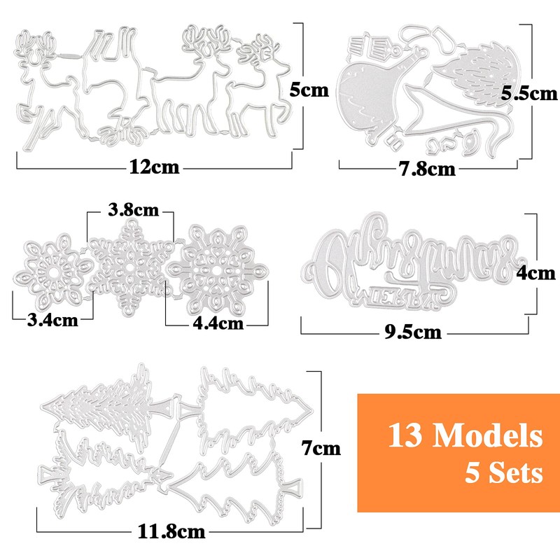 - 🎅【Size】: Deer-12cm x 5cm/4.72" x 1.97"(Approx.). Tree-11.8cm x 7cm/4.69" x 2.8" (Approx.). Snowflake- 4.4cm x 4.4cm/1.73" x 1.73"(Approx.);3.8cm x 3.8cm/1.5" x 1.5"(Approx.);3.4cm x 3.4cm/1.34" x 1.34"(Approx.).Merry Christmas-9.5cm x 4cm/ 3.74" x 1.57"(Approx.).Santa claus-5.5cm x 7.8cm/2.17" x 3.07"(Approx.).Thin stencil can be used on most die-cutting machine.
