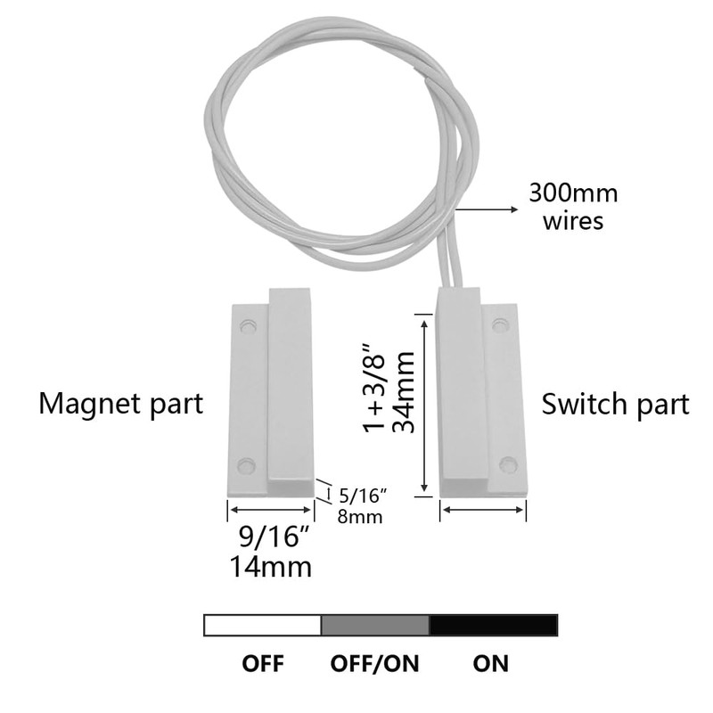- NC type: when door is closed, switch is closed loop, when door is open, switch is open loop