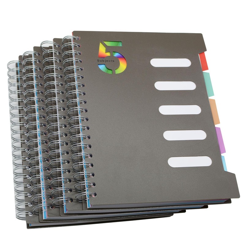 5 Subject Notebook, 10 Inch x 7 Inch B5 Black Spiral Notebook With Waterproof Plastic Softcover, 300 Pages 80 Gsm College Ruled Papers With 5 Sheets Colorful Movable Dividers