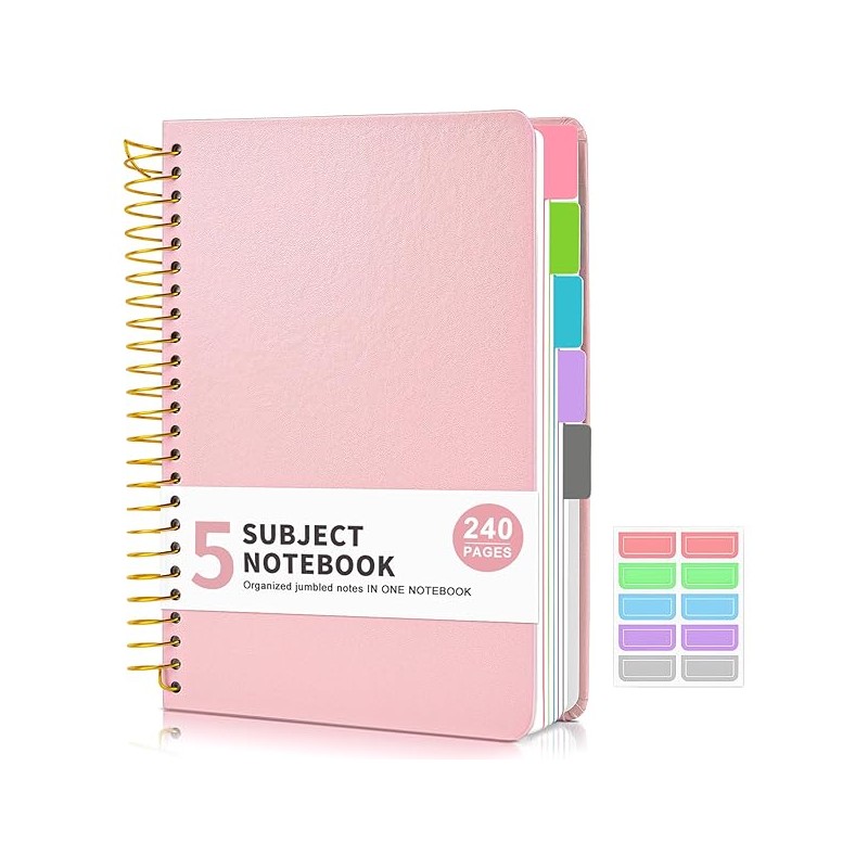 5 Subject Notebook College Ruled, Hardcover Spiral Notebook with Removable Pocket Dividers Tabs, 240 Pages Lined Spiral Journal Notebook for Women, 6x8.5 Notebooks for Work School Note taking A5 Pink