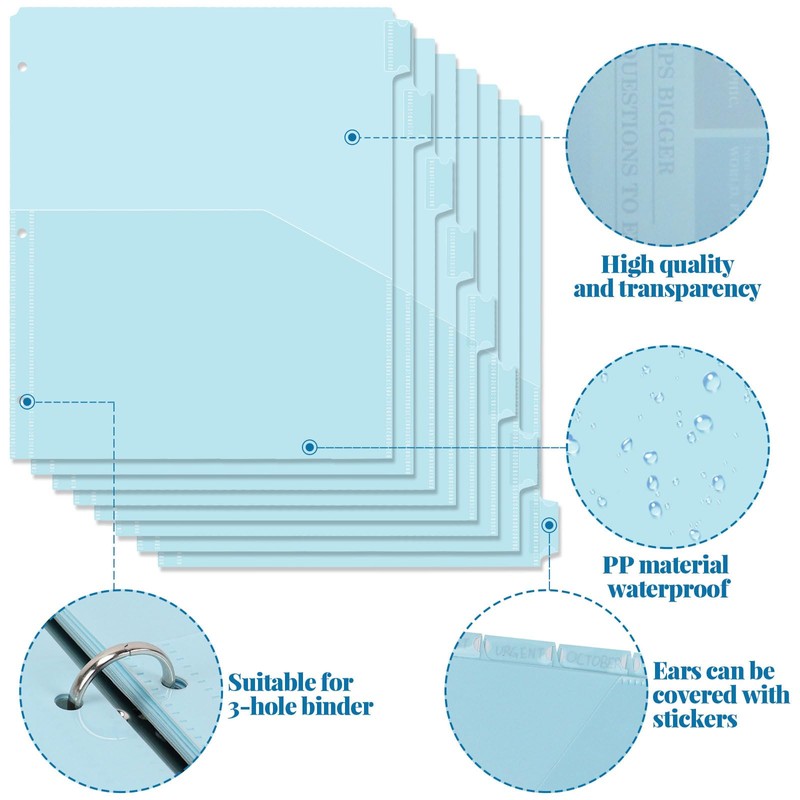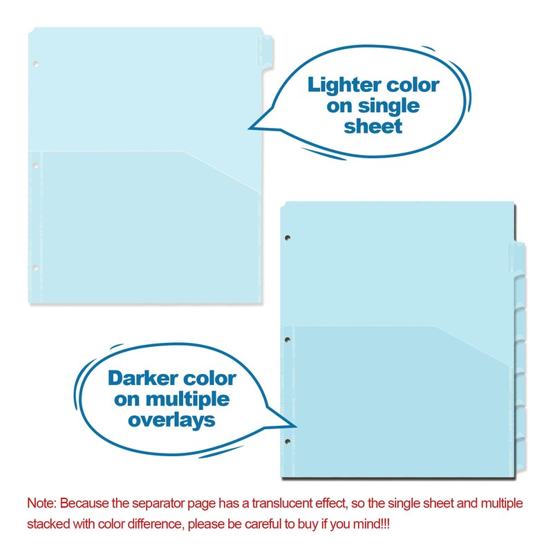 • 【Clear Front Inclined Pocket】Each plastic dividers features an inclined front pocket, are the perfect way to store loose papers in your 3-ring binder divider, and the semitransparent design also offer clear and easy browsing.