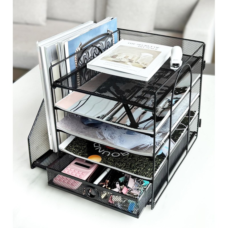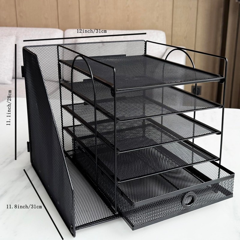 5-Tier Paper Letter Organizer with File Holder, Desk Organizer with Drawer, Mesh Desktop Storage with Magazine Holder for Office Supplies (Black)