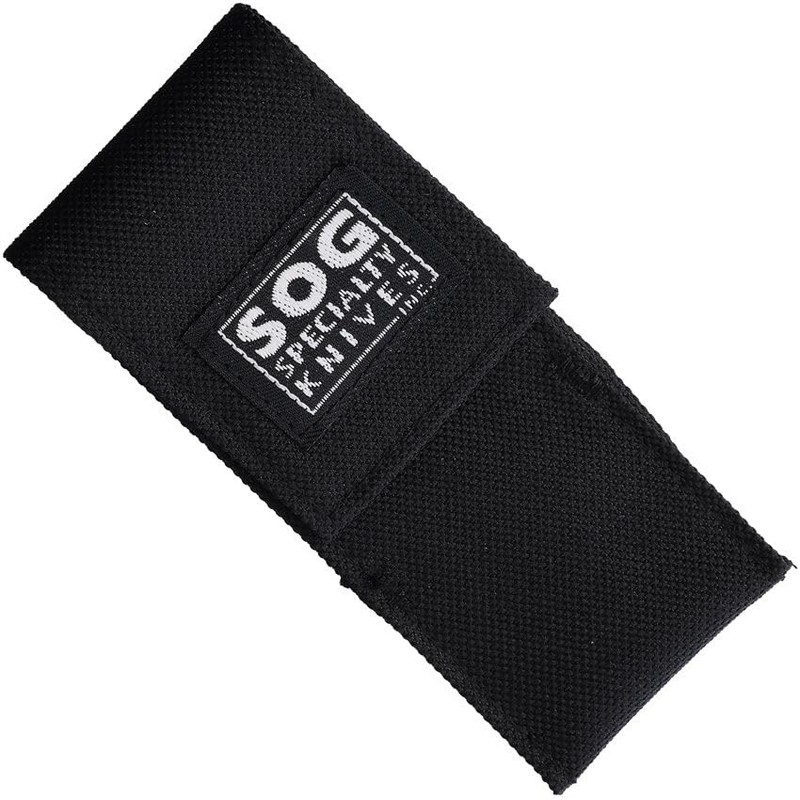 - SOG SPECIALTY Black nylon belt sheath for up to 4" closed folding knife. Exterior 4 5/8" X 2" Interior 4" X 1"