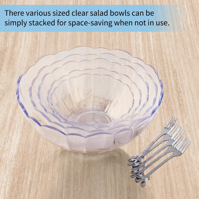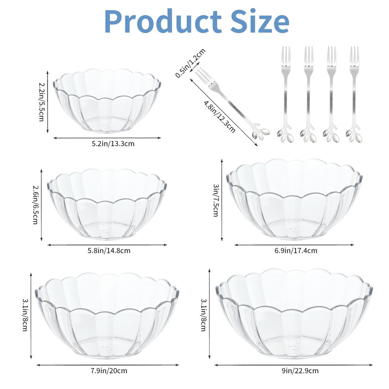 - FULL SET WITH VERSATILE SIZES - Includes 5 clear salad bowls (diameter x height: 13.3 x 5.5 cm, 14.8 x 6.5 cm, 17.4 x 7.5 cm, 20 x 8 cm, 22.9 x 8 cm) and 5 forks, perfect for serving salads, fruits, desserts or snacks. The different sizes are suitable for portion control, family dinners or party presentations.