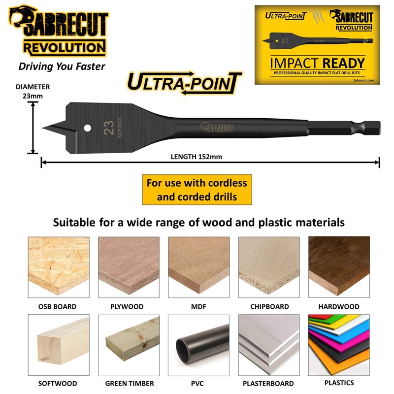 SabreCut Revolution Impact rated spade bits features a extra thick toughened shank designed for use in impact drivers, combi drills and drill drivers. Professional quality impact spade bits with a universal 1/4" hex. Can also be used in standard chucks for a secure non slip fit.