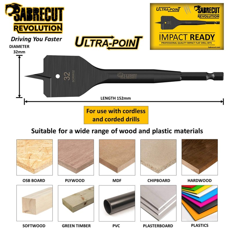 SabreCut Revolution Impact rated spade bits features a extra thick toughened shank designed for use in impact drivers, combi drills and drill drivers. Professional quality impact spade bits with a universal 1/4" hex. Can also be used in standard chucks for a secure non slip fit.