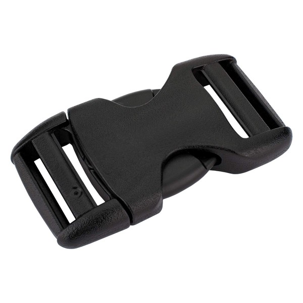 YKK's 1 inch flat dual adjustable plastic buckles can be a key component in any project using 1 inch webbing. These buckles can be adjusted on both sides of the side release buckle. Side release buckles feature an easy, one handed release design that avoids accidental release. Heavy duty buckles differ from standard buckles because they are thicker and have the ability to tolerate greater tension than a standard buckle would. The smooth design of plastic side release buckles disguises their strength and durability. ____Notes on Use: D-rings, buckle, triglides etc. are sized by the size of the webbing or straps they are meant to be used with. These are made for use with 1 Inch webbing or straps. These YKK buckles can be used for various projects such as: (Backpacks) (Purses) (Collars) (Bracelets) (Belts)...and numerous other applications or uses.