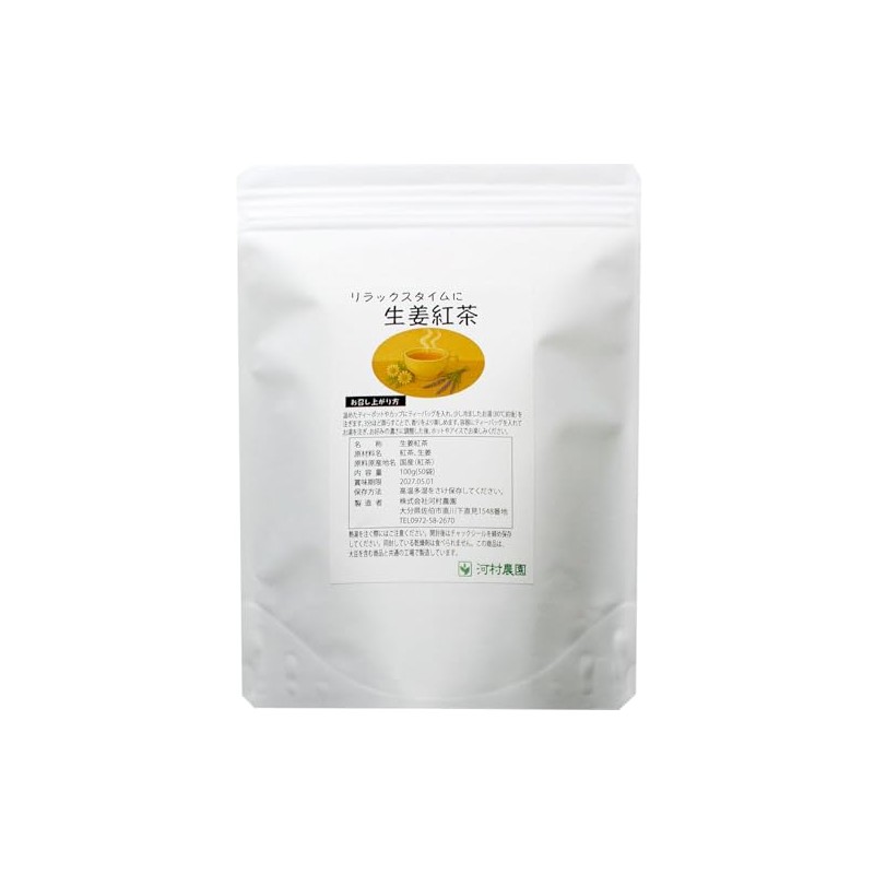 - ■Product Name: Ginger tea; Ingredients: Tea (made in Japan); Ginger (made in Japan); Contents: 3.5 oz (100 g); Shelf life: on the surface of the package; Storage method: Avoid high temperatures and humidity. ■Manufacturer name: Kawamura Farm Co., Ltd. ■Contact information 0972-58-2670 ■Manufacturing area Oita Prefecture
