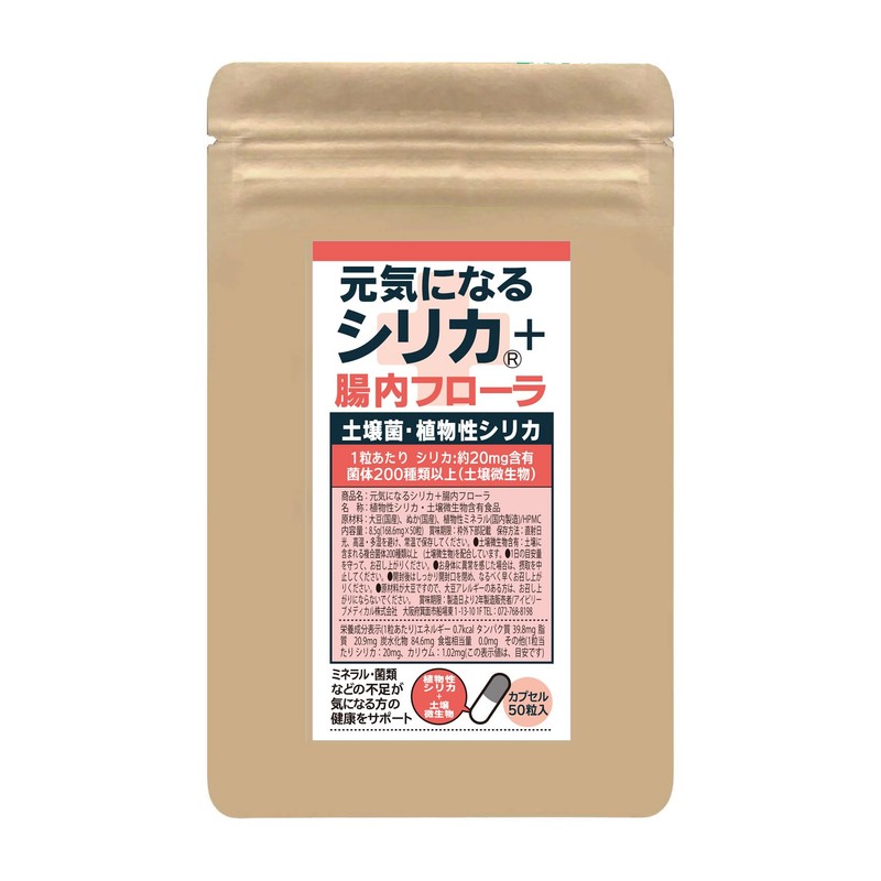 土壌菌・植物性シリカ 1粒あたり シリカ:約20mg含有 菌体200種類以上(土壌微生物) 商品名:元気になるシリカ+腸内フローラ 名 称:植物性シリカ・土壌微生物含有食品  原材料:大豆(国産)、ぬか(国産)、植物性ミネラル(国内製造)/HPMC 内容量:8.5g(168.6mg×50粒) 賞味期限:枠外下部記載 保存方法:直射日光、高温・多湿を避け、常温で保存してください。●土壌微生物含有:土壌に含まれる複合菌体200種類以上 (土壌微生物)を配合しています。●1日の目安量を守って、お召し上がりください。●お身体に異常を感じた場合は、摂取を中止してください。●開封後はしっかり開封口を閉め、なるべく早くお召し上がりください。●原材料が大豆ですので、大豆アレルギーのある方は、お召し上がりにならないでください。 賞味期限:製造日より2年製造販売者/アイビリーブメディカル株式会社 大阪府箕面市船場東1-13-10 1F TEL:072-768-8198