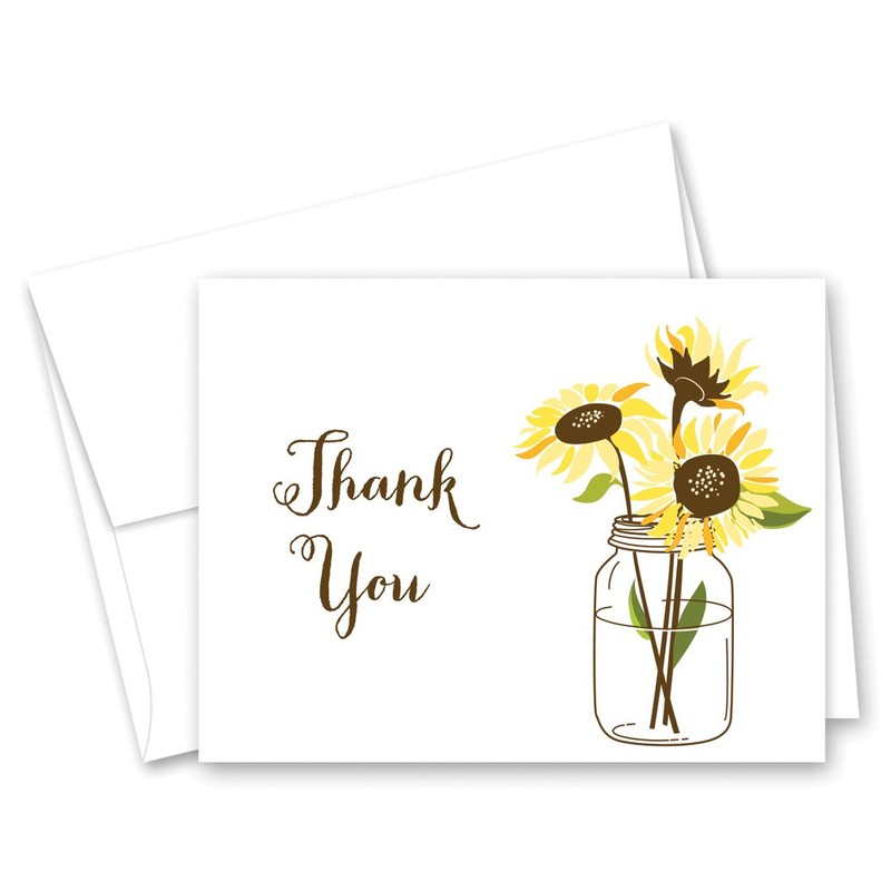 - This charming thank you note features a mason jar full of beautiful rustic sunflowers. Thank you cards are perfect for showing gratitude to your guests who shared your special day with you.