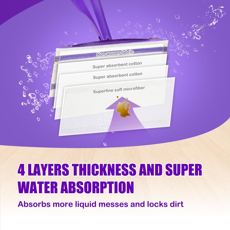 - Thickened Material and Super Absorbency: This replacement pads refills for Wetjet spray mop are made of 4-layer materialmaking them thicker(superfine microfiber, 2 Absorbent cotton and non-woven fabric). And Featuring advanced microfiber ABSORB + LOCK STRIP technology, these wetjet pads refills are highly absorbent, effectively capturing and locking in dirty surfaces, water stains, paper scraps, dust, and even lock in pet hair for a deep and thorough clean,suitable for both dry and wet use