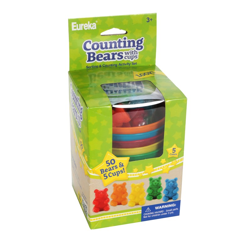 - Plastic counting bears and cups come in five bright colors to help teach children to organize and count.