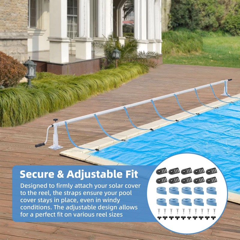- Secure & Adjustable Fit: Designed to firmly attach your solar cover to the reel, these straps ensure your pool cover stays in place, even in windy conditions. The adjustable design allows for a perfect fit on various reel sizes.