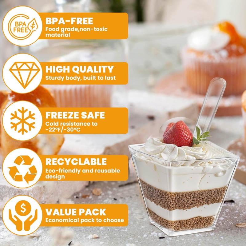 - Quality Material: These small dessert cups are made of high quality clear plastic, crystal clear for displaying beautiful desserts, and odorless, sturdy and freezable