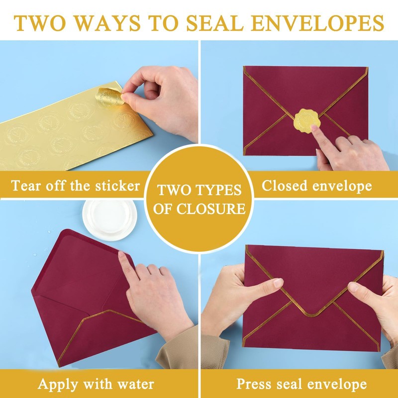 - Easy to Use: Wet the glue on the sealing area of the envelope; then fold it and hold it in place for a few seconds; you can also use the gold sticker that comes with the envelope to seal it