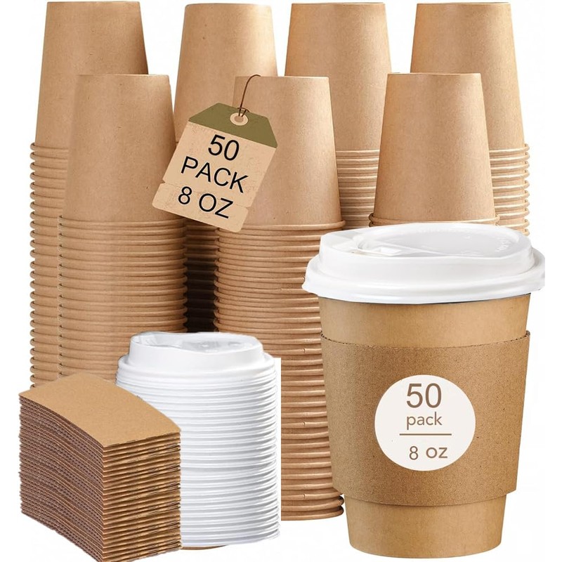- ✅Complete Coffee Cup Set: This pack of 50 8 oz coffee cups also includes lids and sleeves. Our hot coffee cups with lids are the ideal medium capacity for a variety of hot drinks