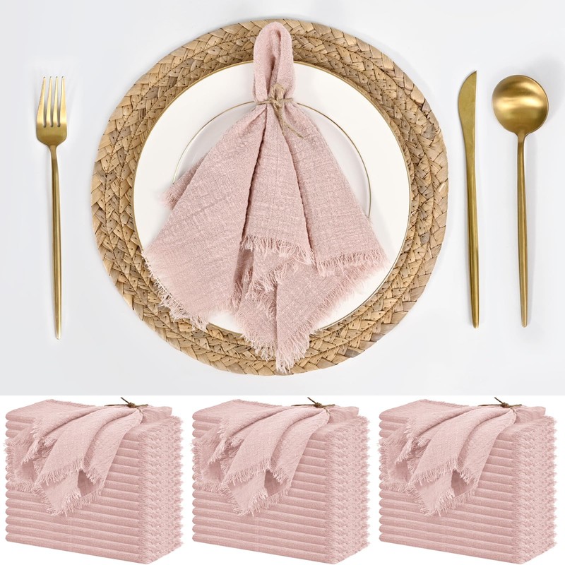 50 Pack Pink Cloth Napkins Cotton Linen Napkins with Fringe Boho Dinner Napkins Cloth