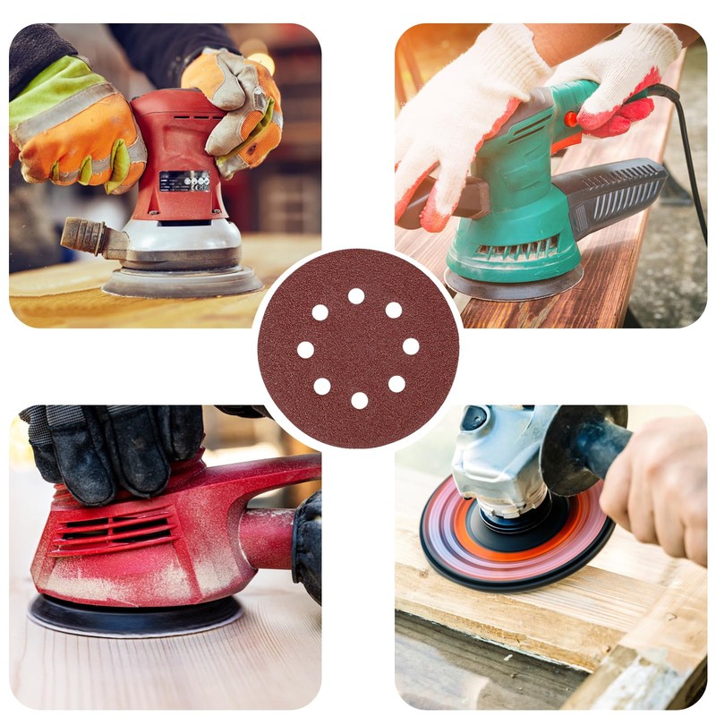 This 5 inch 8 holes hook & loop back sanding disc is perfect for headlamps polishing, wood furniture finishing, drywall sanding,handicrafts, metal polishing, handcrafts, root carving, and synthetic materials.