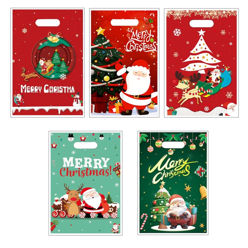 - Party Favor Bags for Kids:Size:16.3x 25.5cm, set of 50 with 5 unique Christmas themed designs,10 each.Enough quantity to meet your needs,It can also be used as a lovely decoration to add color and atmosphere to the Christmas holiday