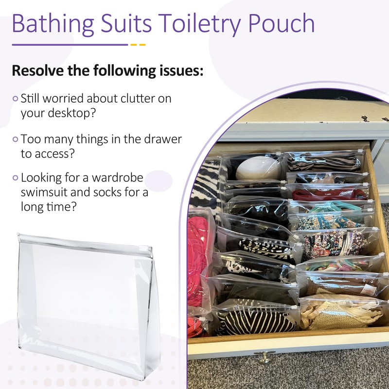 - 50 Clear Cosmetic Bags: Cosmetic travel bag is multifunctional, which can be applied to different occasions to meet daily storage needs. Bathing suit organizer bags can be used to store lotion, cosmetics, makeup brushes, scrunchies, hairpins, swimsuits, socks, keys, toiletries, etc