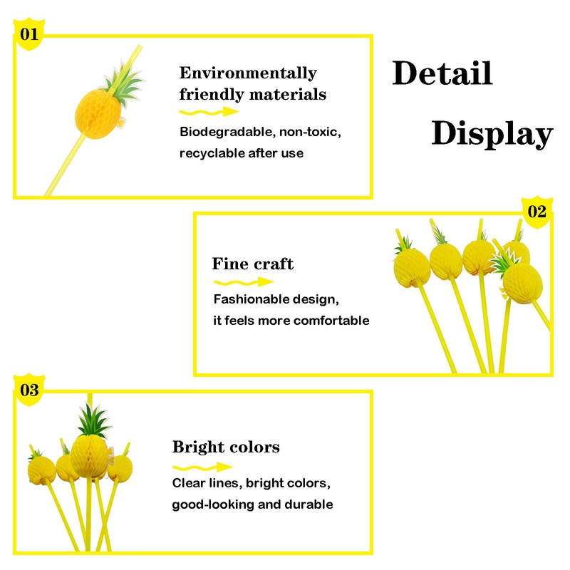 - 【Product Design】The pineapple at the top of the straw have a honeycomb body that you can fold around the straw and secure in place with a tab. The straws are flat-packed and ready for you to assemble. The length can be cropped according to your actual needs.