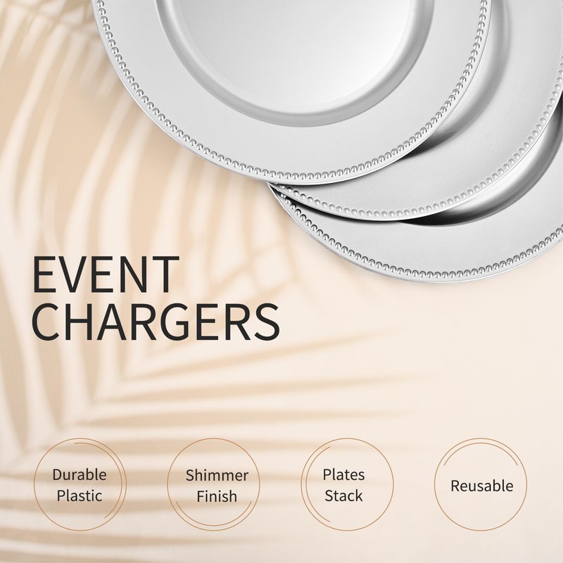 - 【Package Includes】Each set includes 50 pcs Silver charger plates with beads, each about 13 inches/ 33 cm in diameter, suitable size and sufficient quantity, enough for your daily use, replacement and sharing needs. Great decorative round charger plate is sure to impress your guests with stunning beauty, giving your dining table the perfect look.