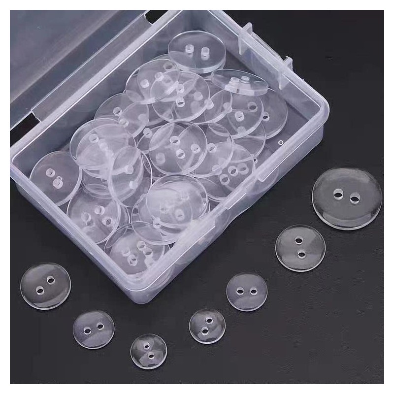 • Package contents: you will receive 50 transparent buttons. The size of these clear buttons is 15mm (1.5cm). They are round and have 2 holes for sewing.