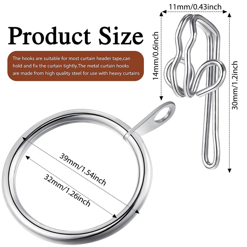 - Size details: curtain hook measures 28 mm/ 1.1 inch in length; The inner diameter of the curtain rod ring is 32 mm/ 1.26 inch, and the outer diameter is 39 mm/ 1.5 inch