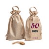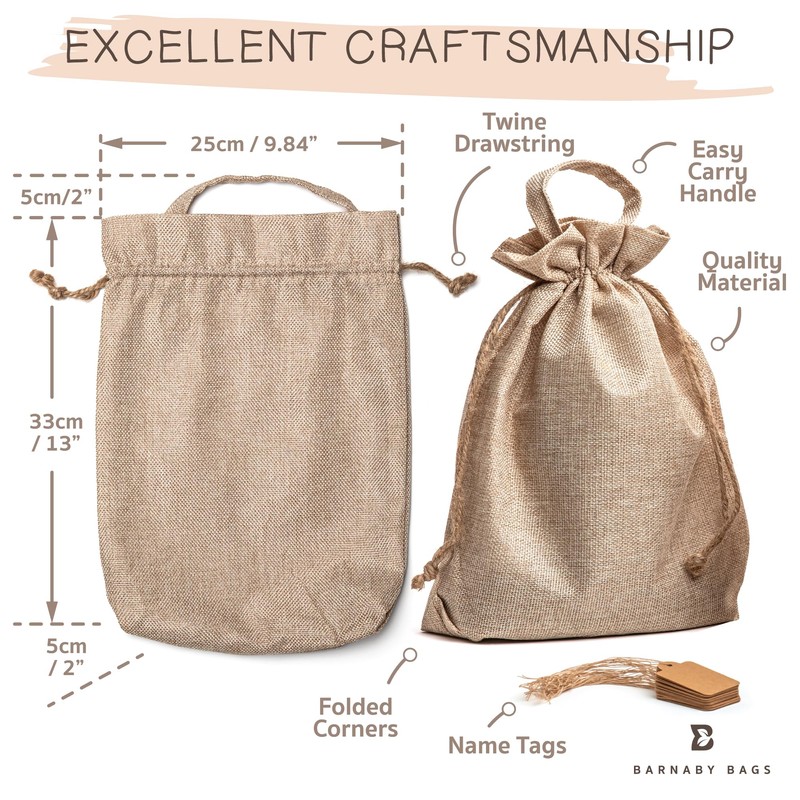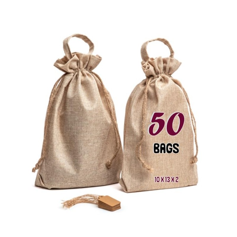 - ●Made from Future-Friendly Jute Fabric: The 50 small drawstring gift bags measure 13" x 10" x 2" and are made from top-quality burlap with tear-resistant, sewn-in corners; Also, the protective liner inside of each bag takes their durability to the next level