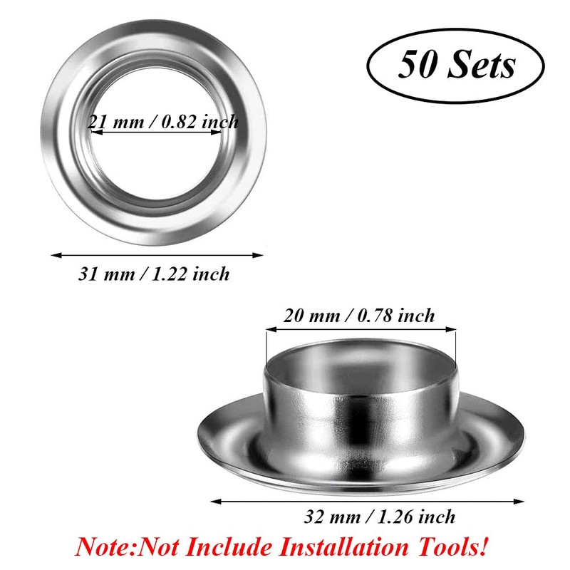 - Easy to use: our eyelet set with eyelets is easier to install. The inner hole diameter of the large nozzle is approx. 20mm Large size is suitable for a wider range. First use a hole tool to drill a hole in the fabric and remove the hole set. Finally, the tightening tool to attach the eyelet set well. (Installation tools not included)