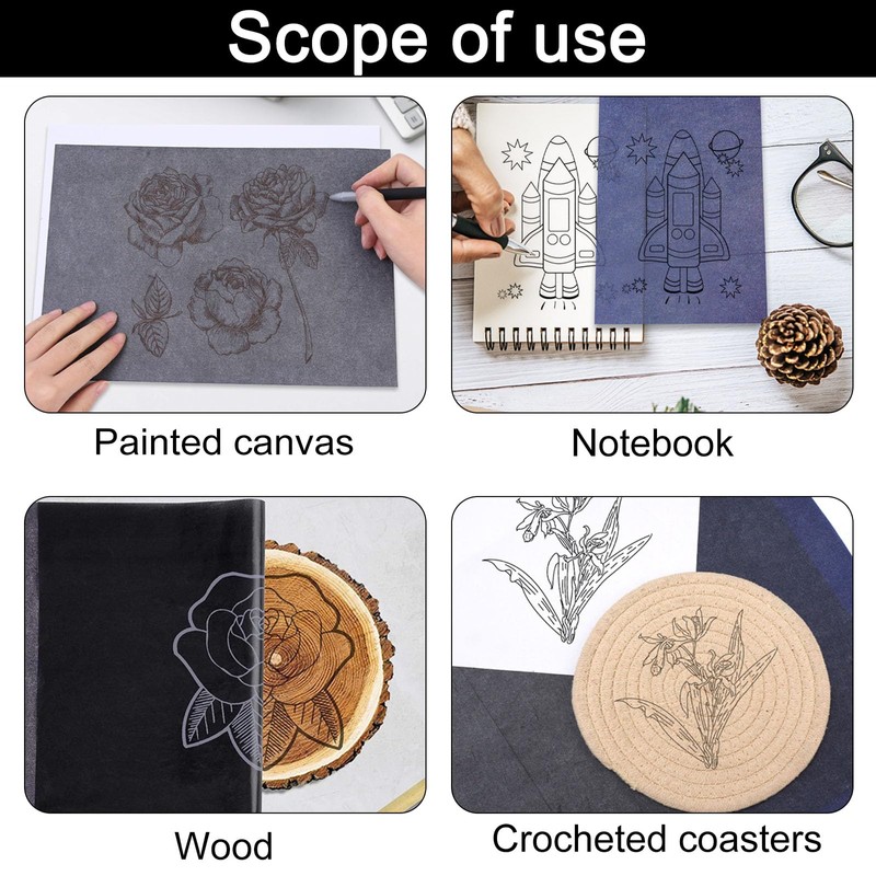 - Wide application: graphite carbon paper suits are ideal for home or office use as well as for arts and crafts projects. tracing paper transfer paper can be used for tracing and transferring designs or patterns on canvas, paper, wood, canvas, glass, metal, ceramic, clay, lightweight fabrics and more.