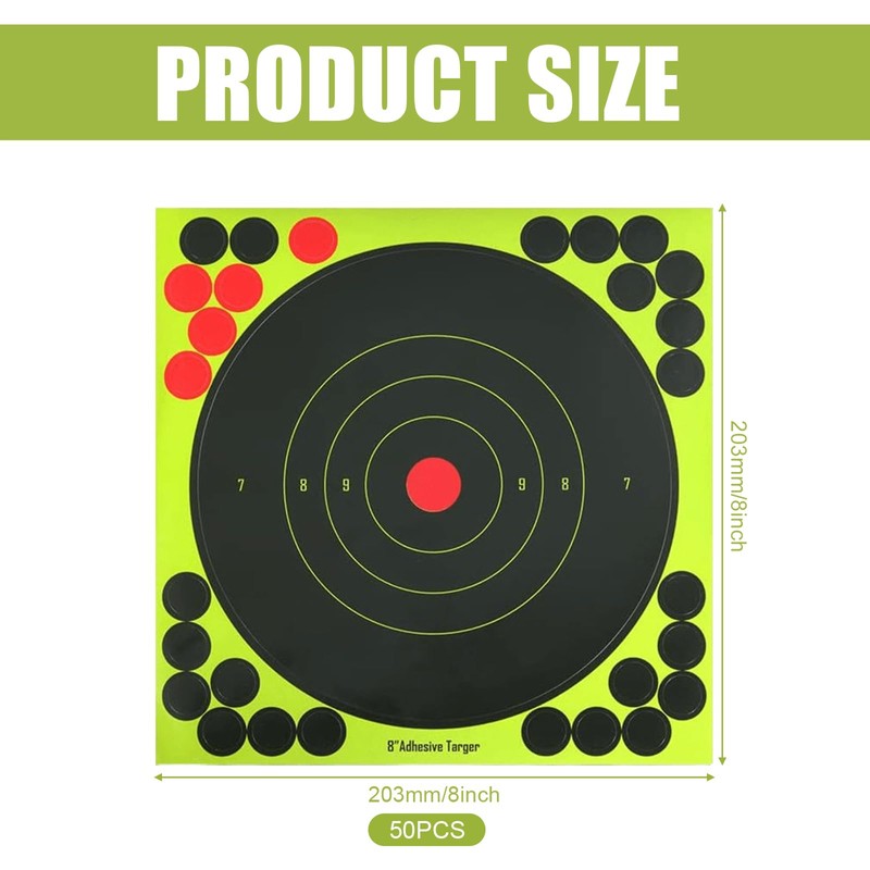 - Pack of 50 archery targets: the size of 10 rings targets is 20.3 x 20.3 cm / 8 inches.