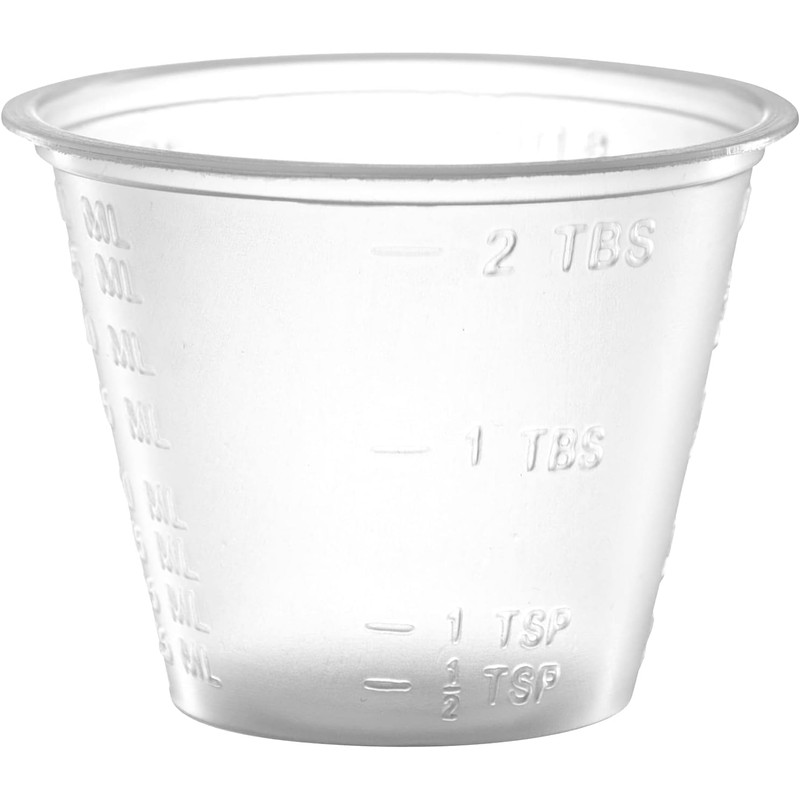 - Precise calibrations prevent dosing errors. - Sanitary way to distribute liquid or solid medicine. - Also great for measuring ingredients, distributing food samples, or small desserts and snacks. - Clear design with embossed measurements for easy identification of contents. - Durable polypropylene - Height 1 3/8 Inches Bottom Diameter 1 1/8 Inches Top Diameter 1 7/8 Inches