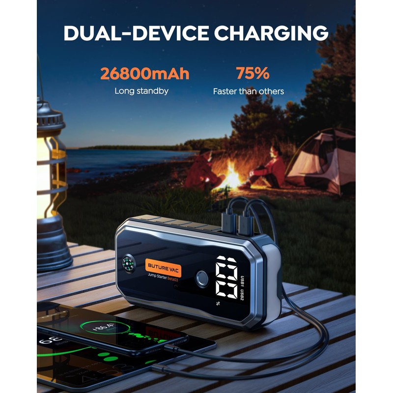- 【MULTI-PURPOSE QUICK BATTERY CHARGER】Massive 26800mAh jump starter battery pack with German latest chip, has 2 quick USB ports with included EC5 cigarette lighter adapter for charging wide variety of electronic or 12V DC devices like smartphones, tire pumps, car refrigerators.