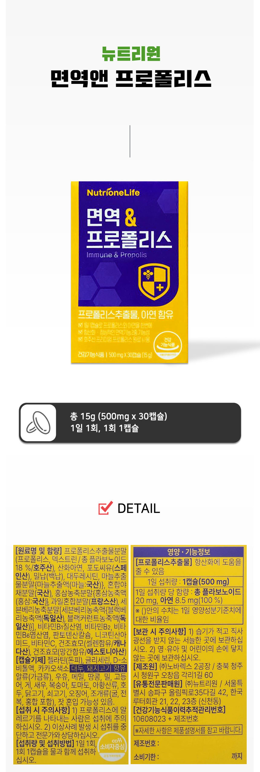 뉴트리원 면역앤 프로폴리스 500mg 30캡슐/mjc NutriOne Immune & Propolis 500mg 30 Capsules