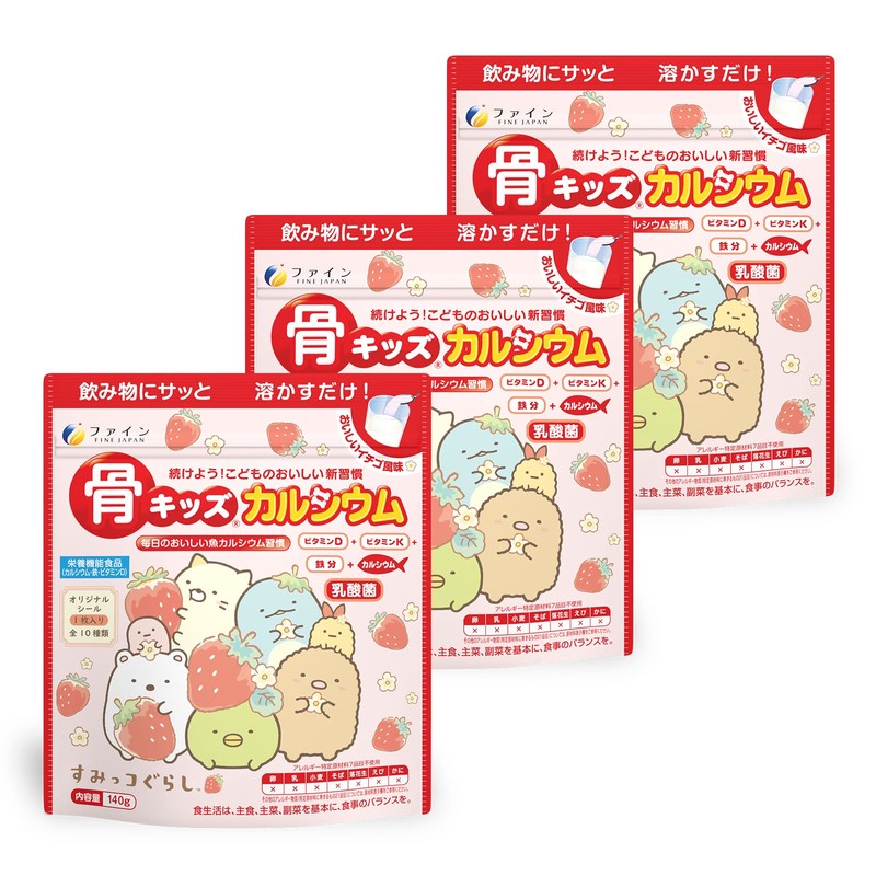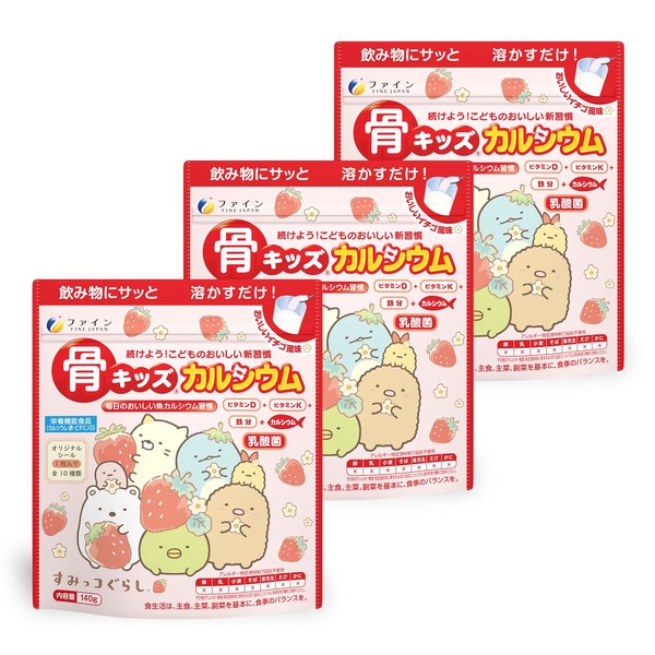 ファイン 骨キッズ カルシウム カルシウム 500mg 鉄 7.5mg 乳酸菌 ビタミンD ビタミンK 配合 イチゴ 風味 国内製造 140g (14杯分) × 3個セット